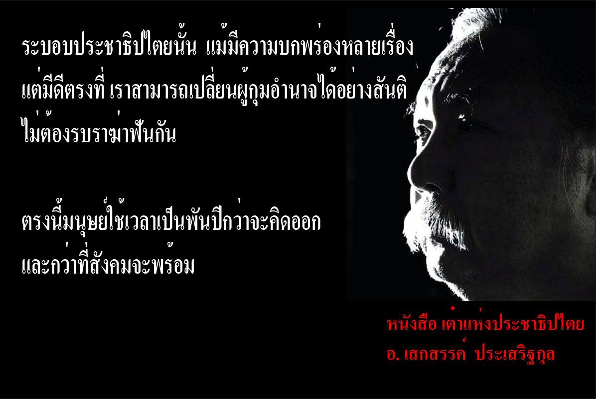 ระบอบประชาธิปไตยนั้นแม้มีความบกพร่องหลายเรื่องแต่มีดีตรงที่เราสามารถเปลี่ยนผู้กุมอำนาจได้อย่างสันติ ไม่ต้องรบราฆ่าฟันกัน