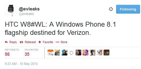 เจ้าพ่อข่าวลืออย่างบัญชีทวิตเตอร์ @evleak ออกมาระบุว่า HTC เตรียมส่งมือถือเรือธงรุ่นต่อไปสำหรับฝั่ง Windows phone 8.1 ในนาม HTC W8 ซึ่งจะวางจำหน่ายบนเครือข่าย Verizon ของอเมริกา (ยังไม่ยืนยันว่าจะมีรุ่นวางขายทั่วโลกหรือไม่) ส่วนรายละเอียดอื่นๆยังไม่มีการระบุออกมา