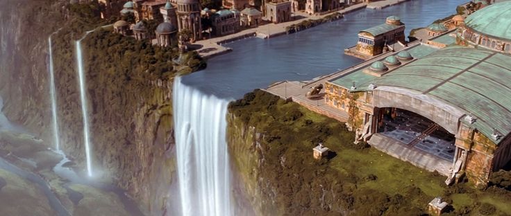 ฝ่ายเจไดเข้ามาทางโรงเก็บยานอวกาศด้านซ้ายสุดติดน้ำตกที่ใหญ่ที่สุดของเมือง