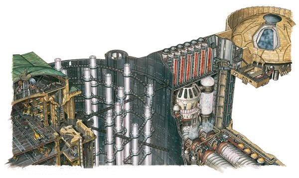 ภายในศูนย์ Plasma Refinery Complex เป็นแบบนี้ ซ้ายคือโรงเก็บยาน ทางที่ใกล้ที่สุดที่จะไปโดมที่ 4 หรือสำนักพระราชวังที่อยู่ขวามือสุดต้องผ่านโดมที่ 2 ซึ่งเป็นโรงกลั่นพลังงานพลาสม่าจากแกนกลางของดาวนาบู และโดมที่ 3 ที่เป็นโรงเก็บพลังงานพลาสม่าที่มีประตูม่านเลเซอร์กั้นก่อนถึงปล่องซ่อมบำรุงซึ่งเป็นทางลงไปยังถังเก็บพลังงานพลาสม่าใต้ดิน