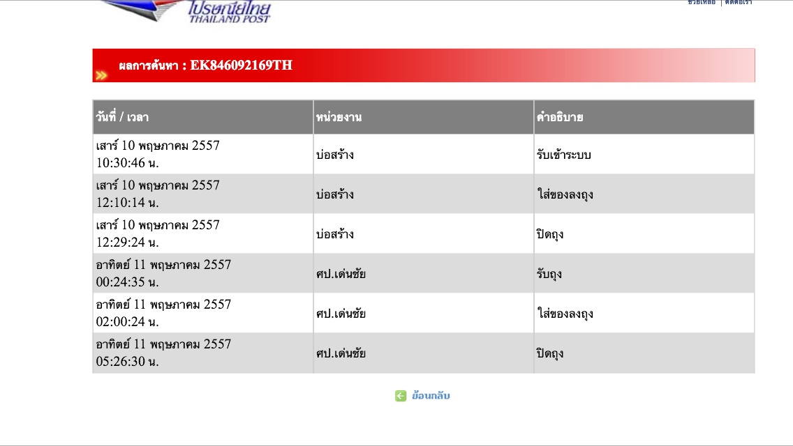 ขออนุญาตพิมพ์แทนนะค่ะเพราะลงรูปไม่ได้ ปณ.คลองด่าน เข้า 24/1/60 13.39 ออก 24/1/60 16.38 ศป.Ems เข้า 24/1/60 22.06 ออก 25/1/60 01.00 ปณ.เชียงราย เข้า 25/1/60 10.00 ออก 25/1/60 10.00 ศป Ems เข้า 25/1