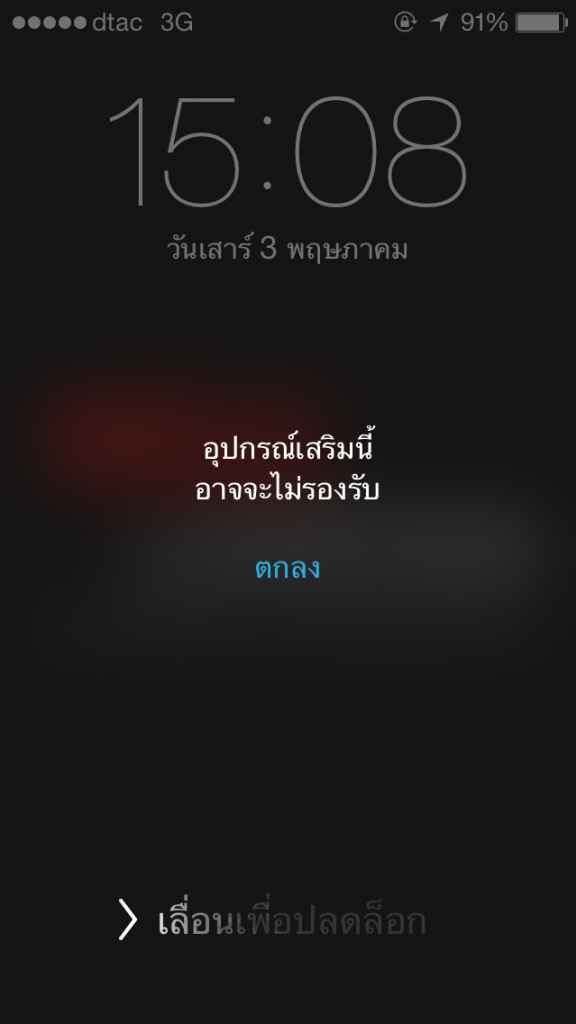 แต่ว่าพอชาร์จไปหน้าจอ IPhone ก็เตือนว่าไม่รองรับอุปกรณ์เสริมนี้ ทั้งๆที่เป็นสายแท้ที่ติดมากับกล่องอ่ะครับ