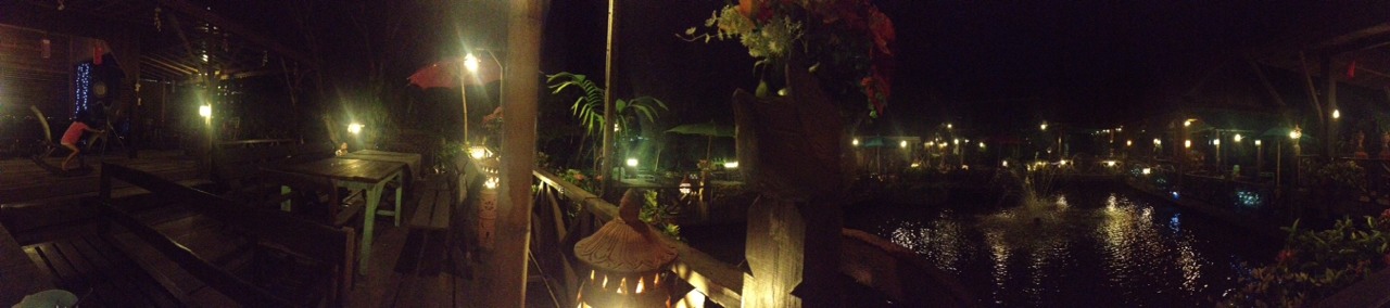 บรรยากาศร้านถือว่าค่อนข้างดี ออกแนวบ้านไม้ไทยๆ มีบ่ออยู่ตรงกลาง ได้ยินเสียงน้ำตลอดเวลา มีปลาคาร์ฟว่ายน้ำ