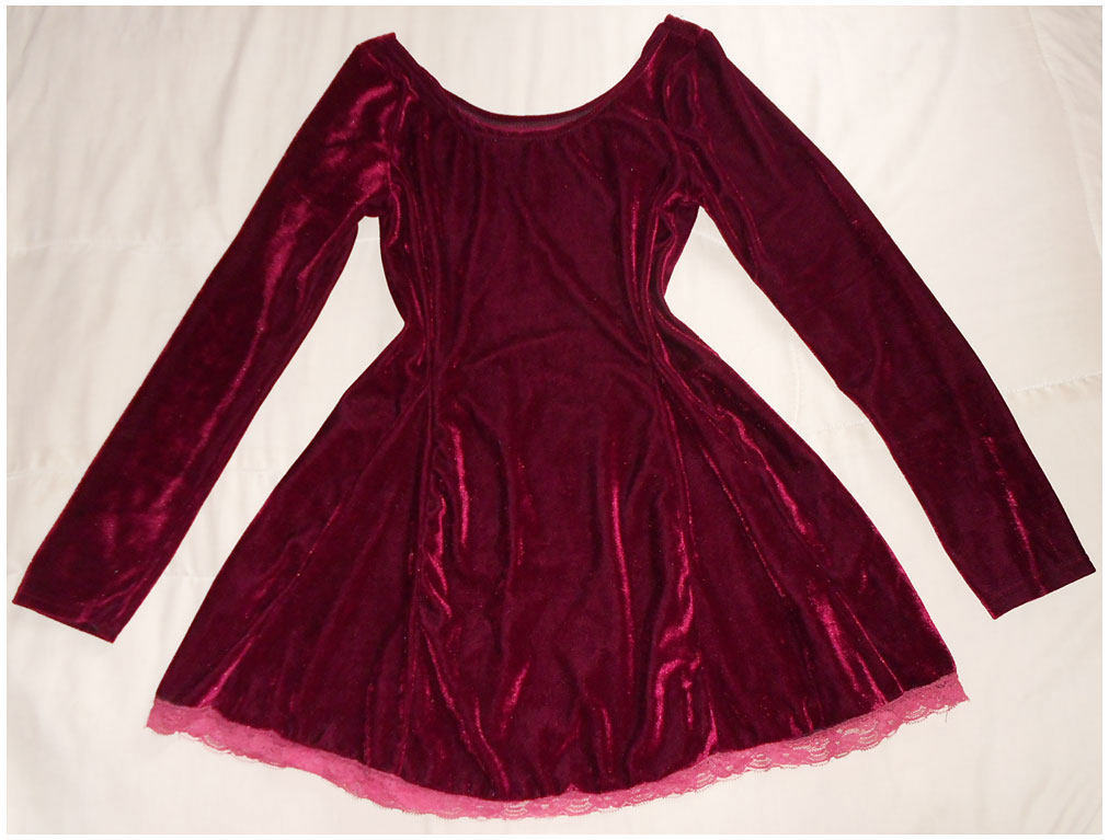 เดรสกำมะหยี่สีแดงเหลือบชมพู อก 34 เอว 26-28 ยาว 30 นิ้ว