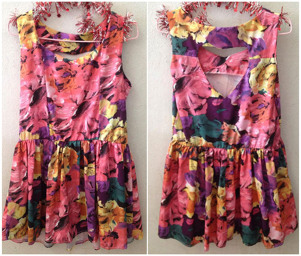 new ซักเก็บ (ได้มาใหญ่ไป) เดรสลายดอกผ้าเนื้อแน่นๆ สีสด เว้าหลังรูปหัวใจ อก 34-36 เอว 30 ยาว 30 นิ้ว