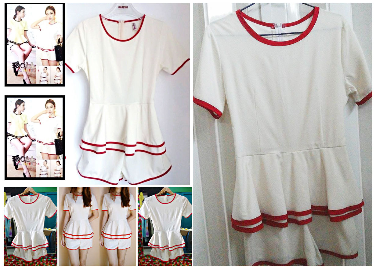 ชุดเพลสูทสีขาวขอบสีแดง ผ้าหนาไม่ใช่ชีฟอง อกได้ถึง 36 เอวยืด 25-34 สะโพก 38 ยาว 30 นิ้ว