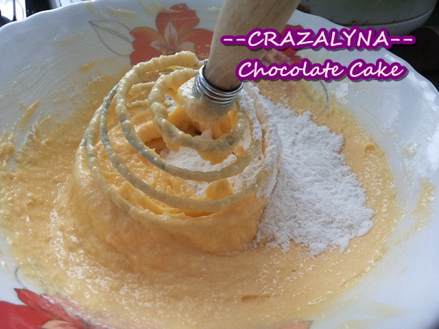 เทผงฟูลงในแป้งเค้ก แล้วร่อนผสมกัน ประมาณ 3-4 รอบ แล้วพักไว้