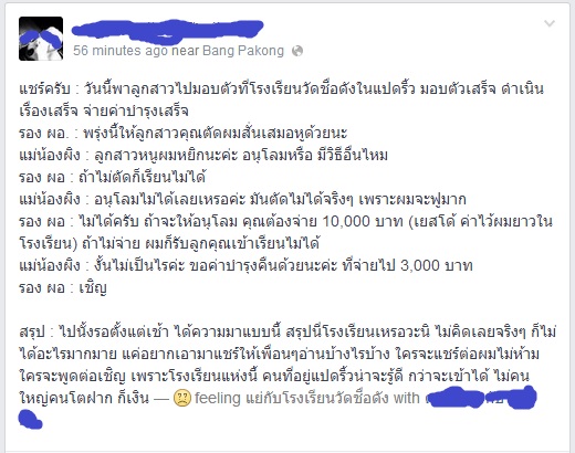 แม่น้องผิง : งั้นไม่เป็นไรค่ะ ขอค่าบำรุงคืนด้วยนะค่ะ ที่จ่ายไป 3,000 บาท