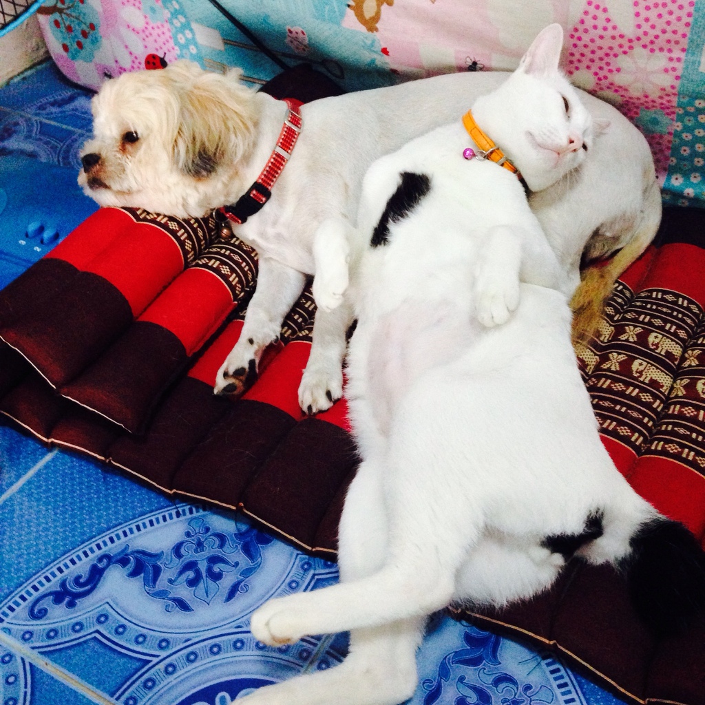 เนื่องจากเราผ่าตัดซีท นอนโรงพยาบาล เทียวเข้าเทียวออก หลายหน เรานอนคิดถึงครอบครัว ซึ่งรวมทั้งหมากับแมว วัว กระต่าย ไก่แจ้ สัตว์เลี้ยงที่เรารักมากๆ ที่คิดถึงที่สุดคือหมากับแมว เลยจะขอแชร์รูปน่ารักๆของลูกๆ เราคิดว่าจะทำให้คุณยิ้มได้บ้างนะคะ เพราะตัวเราเอง เวลาเห็นรูปหมาหรือแมวของคนอื่นยังอดยิ้มไม่ได้ในความน่ารัก ทำให้มีความสุข เวลาเรานอนอยู่โรงพยาบาลเหงาๆเราก็หยิบรูปเก่าๆที่ถ่ายไว้ในมือถือมาดู คลายเหงาและคิดถึงได้บ้าง บางทีคุยโทรศัพท์กับคุณแม่ พอเปิดลำโพงเค้าได้ยินเสียงเราพูด เรียกชื่อเค้า เค้าเห่าหากระดิกหาง มองตามเสียงเงี่ยหูฟังจากมือถือของคุณแม่ ท่าทางดีใจมากๆ เราได้ยินเค้าเห่าก็ฟังไปน้ำตาไหลไป เพราะดีใจด้วยล่ะที่ลูกๆจำเสียงแม่ได้ดีใจที่ได้ยินเสียงแม่ เราร้องให้เลยล่ะค่ะ เรานี่บ่นพร่ำเยอะจัง ลงรูปดีกว่านะคะ เชิญชมค่ะ