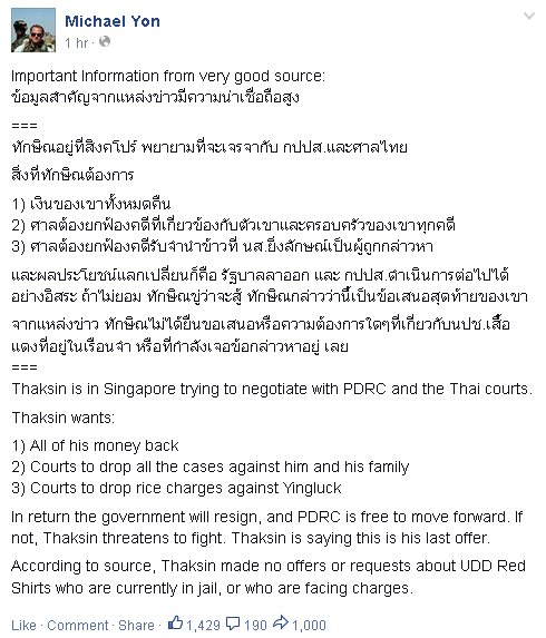 เมื่อช่วงเย็นข่าวออกมาว่าทักษิณบินไปสิงคโปร์ พร้อมครอบครัว ไปหาหมอ คุยธุรกิจ แต่ตอนนี้ 3ทุ่มกว่าๆ เครื่องบินกลับเลี้ยวออกตะวันตก โดยความเร็วเครื่องบินไม่ลดลงเลย คนจึงเดากันว่าดูไบแน่ๆ เหมือนจะหนีอีกแล