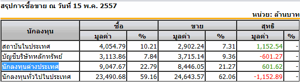 สรุปการซื้อขาย ณ วันที่ 15 พ.ค. 2557