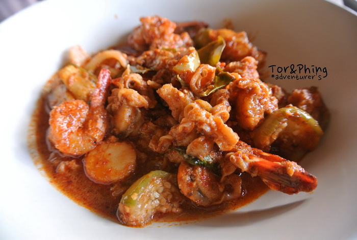 สักพัก พี่พนักงานก็ยกกับข้าวจานแรกออกมาเป็นผัดพริกแกงทะเลที่ค่อนข้างเผ็ดแต่อร่อยครับ