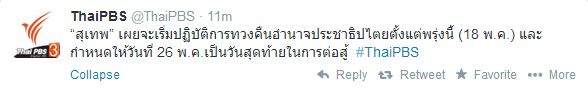 “สุเทพ” เผยจะเริ่มปฏิบัติการทวงคืนอำนาจประชาธิปไตยตั้งแต่พรุ่งนี้ (18 พ.ค.) และกำหนดให้วันที่ 26 พ.ค.เป็นวันสุดท้าย.....