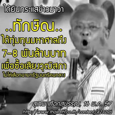 ขอให้ม๊อบ ผู้ดี มีสตางค์ เหล่าดาราศิลปิน ไฮซ้อไฮโซทั้งหลาย รวบรวมเงินให้ได้แสนล้านบาทไปช่วยชาวนาที่กำลังทุกข์ยากลำบากอยู่ตอนนี้นะครับ ให้คุณศักชัย กาย ออกแบบ เสื้อยืด นกหวีด แว่นตา ที่คาดผม ลายธงชาต