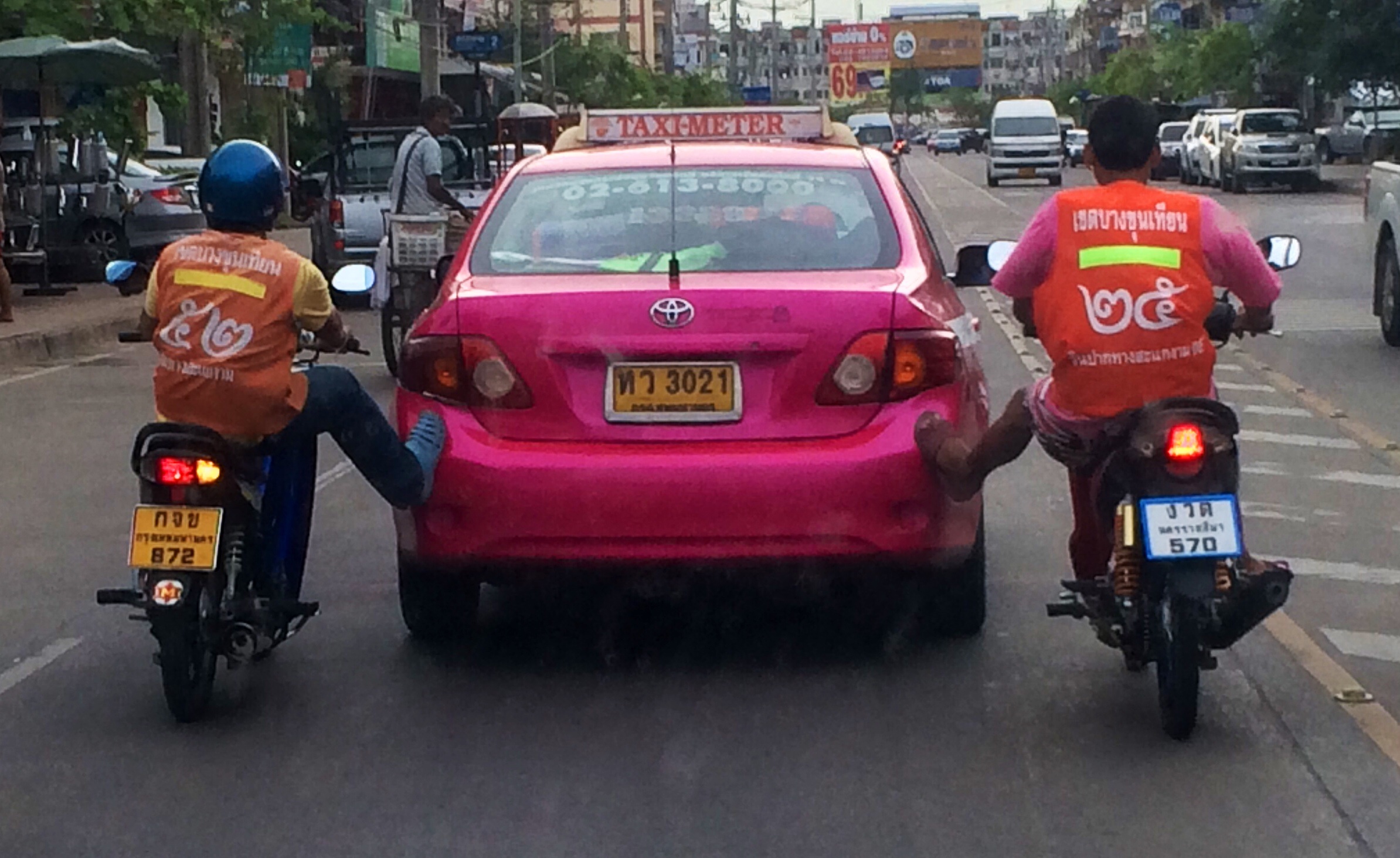 สอง มอเตอร์ไซด์ รับจ้าง ไล่ถีบ Taxi กลางถนน ผู้คนที่พบเห็น มองดูด้วยความชื่นชม หน้าตาเฉย