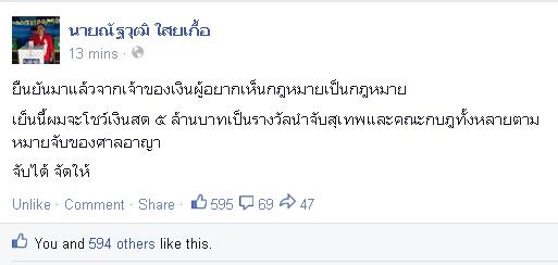 เย็นนี้ผมจะโชว์เงินสด ๕ ล้านบาทเป็นรางวัลนำจับสุเทพและคณะกบฎทั้งหลายตามหมายจับของศาลอาญา .... ณัฐวุฒิ ใสยเกื้อ
