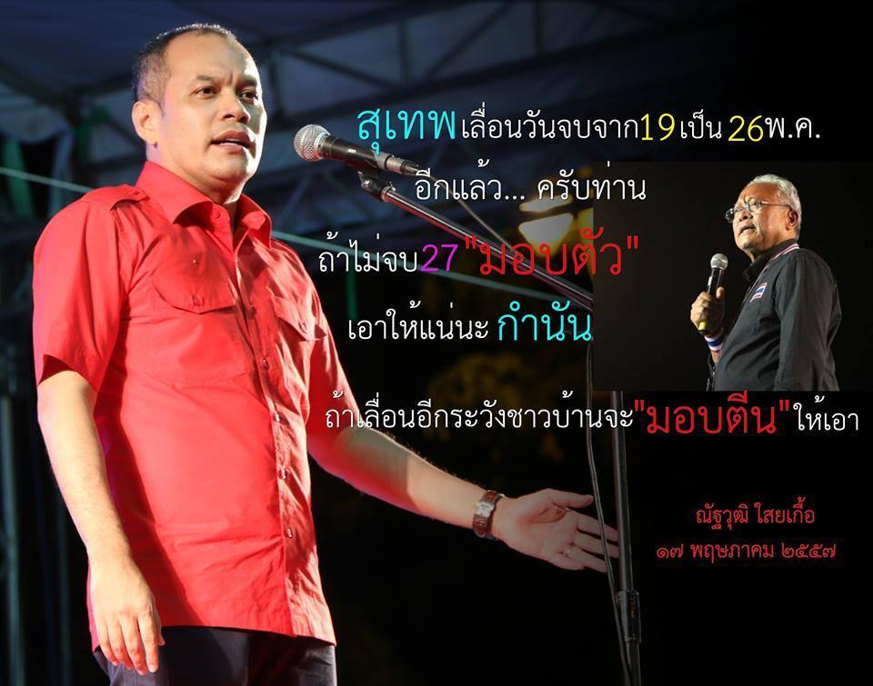 ณัฐวุฒิ ไสยเกื้อ เคยประกาศก้องบนเวทีเสื้อแดง ว่าเสื้อแดงสู้เพื่อประชาธิปไตย ไม่ได้สู้เพื่อตัวบุคคล หากวันใดทักษิณเป็นศัครูกับประชาธิปไตย ก็จะเป็นศัครูกับทักษิณ ทักษิณทำอะไร พ