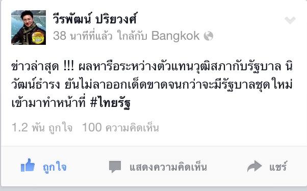 อ่านข่าวจากเดลินิวส์ ต่อมาเวลา 17.30 น. นายพีระศักดิ์ พอจิต ส.ว.อุตรดิตถ์ ว่าที่รองประธานวุฒิสภาคนที่สองแถลงว่า ภายหลังจากที่ได้มีการหารือกับรัฐบาลซึ่งรัฐบาลยืนยันว่า ไม่ลาออกจากตำแหน่ง โดยอ้างรัฐธรร