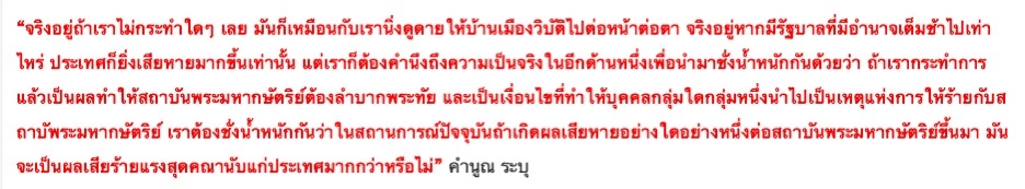 “จริงอยู่ถ้าเราไม่กระทำใดๆ เลย มันก็เหมือนกับเรานิ่งดูดายให้บ้านเมืองวิบัติไปต่อหน้าต่อตา จริงอยู่หากมีรัฐบาลที่มีอำนาจเต็มช้าไปเท่าไหร่ ประเทศก็ยิ่งเสียหายมากขึ้นเท่านั้น แต่เราก็ต้องคำนึงถึงความเป็นจริงในอีกด้านหนึ่งเพื่อนำมาชั่งน้ำหนักกันด้วยว่า ถ้าเรากระทำการแล้วเป็นผลทำให้สถาบันพระมหากษัตริย์ต้องลำบากพระทัย และเป็นเงื่อนไขที่ทำให้บุคคลกลุ่มใดกลุ่มหนึ่งนำไปเป็นเหตุแห่งการให้ร้ายกับสถาบัพระมหากษัตริย์ เราต้องชั่งน้ำหนักกันว่าในสถานการณ์ปัจจุบันถ้าเกิดผลเสียหายอย่างใดอย่างหนึ่งต่อสถาบันพระมหากษัตริย์ขึ้นมา นจะเป็นผลเสียร้ายแรงสุดคณานับแก่ประเทศมากกว่าหรือไม่” คำนูณ ระบุ