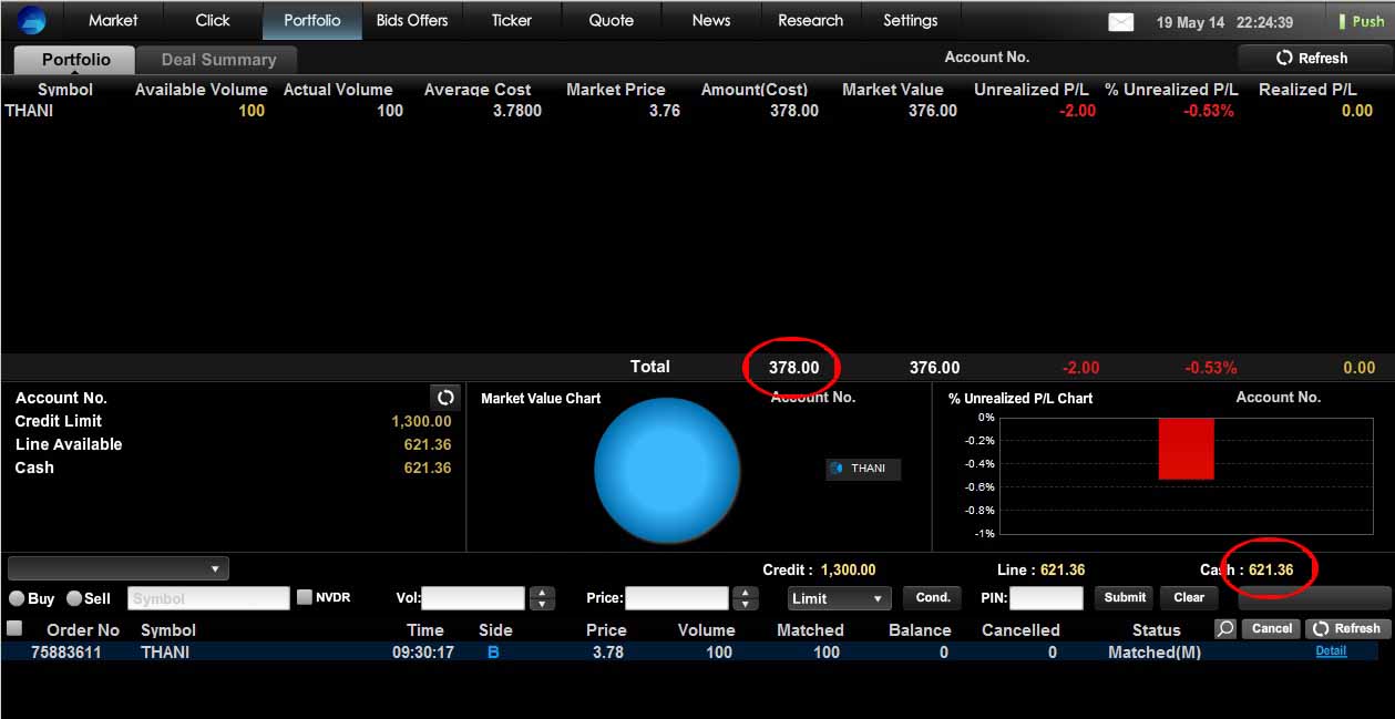 วันนี้ เสนอซื้อ THANI ไป = 100 หน่วย x ราคา 3.78 บาท
