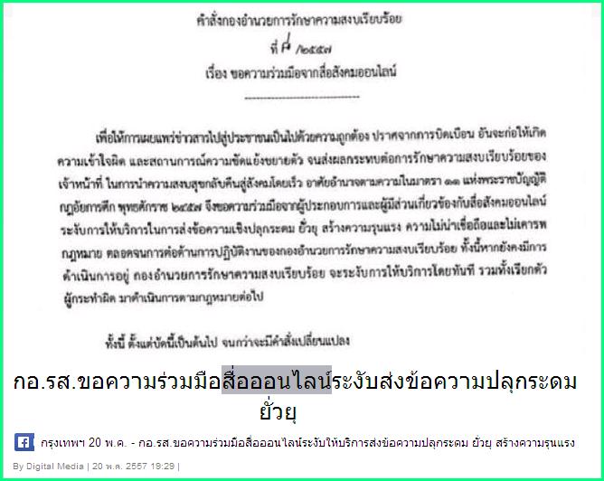 กองอำนวยการรักษาความสงบเรียบร้อย (กอ.รส.) มีคำสั่งฉบับที่ 8/2557 เรื่อง ขอความร่วมมือจากสื่อสังคมออนไลน์ เพื่อให้การเผยแพร่ข่าวสารไปสู่ประชาชนเป็นไปด้วยความถูกต้อง ปราศจากการบิดเบือน อันจะก่อให้เกิดความเข้าใจผิด และสถานการณ์ความขัดแย้งขยายตัว
