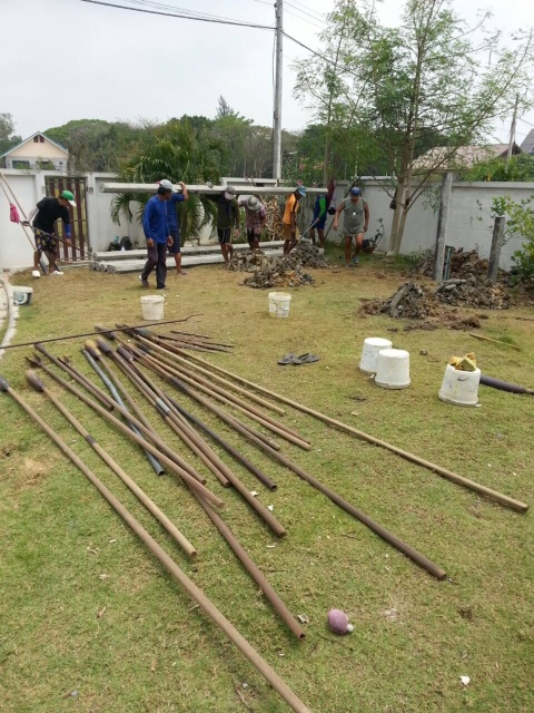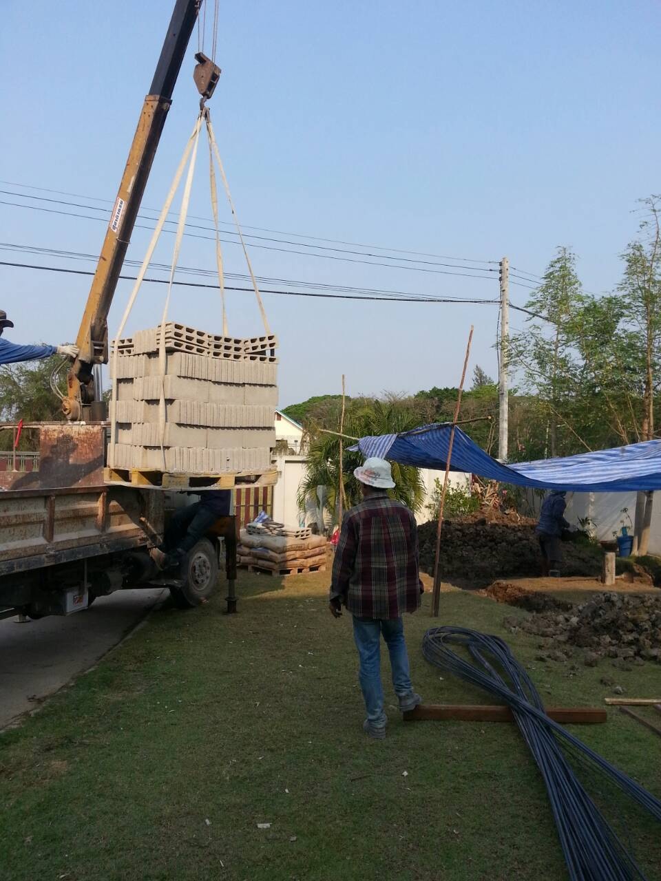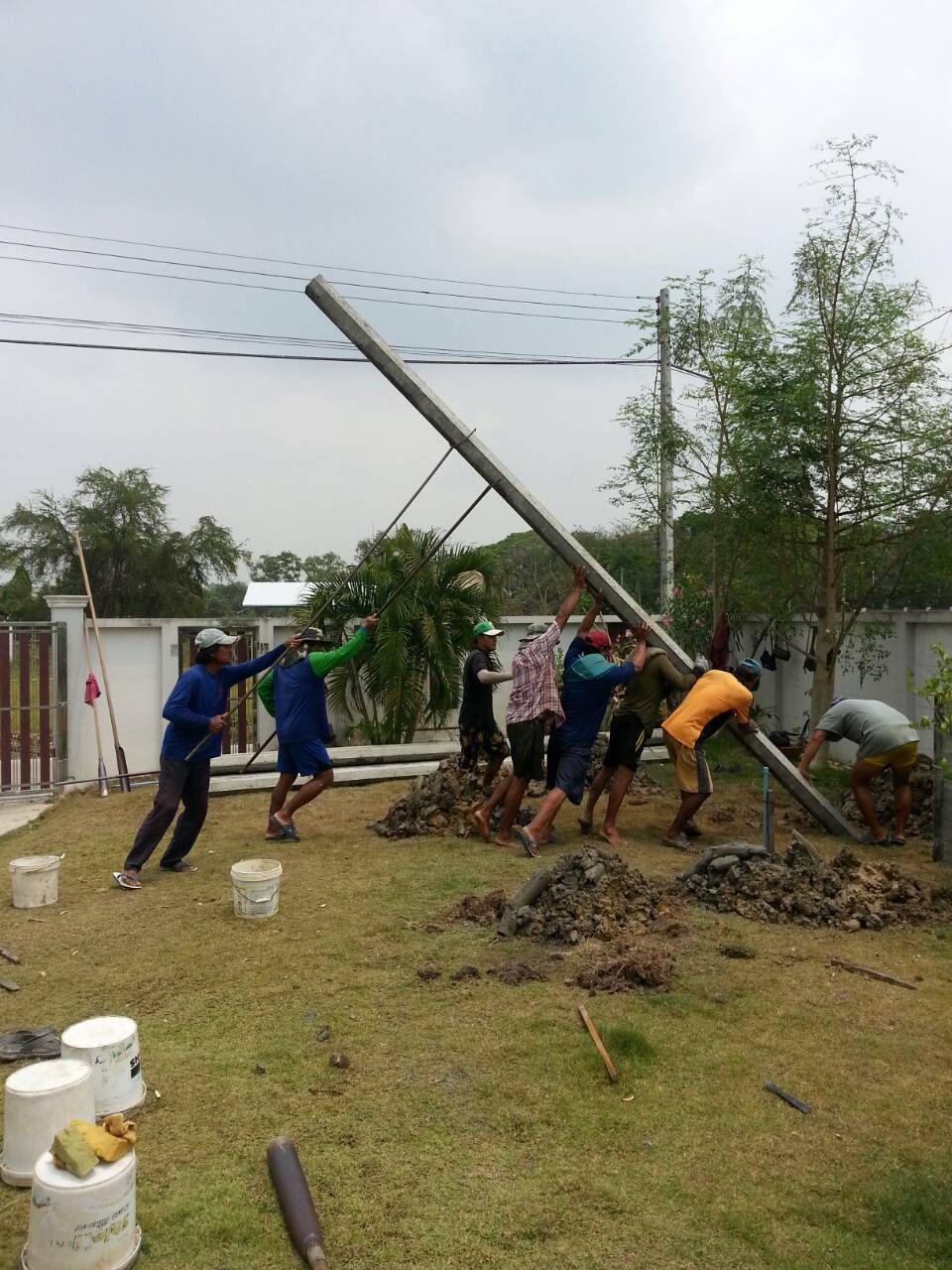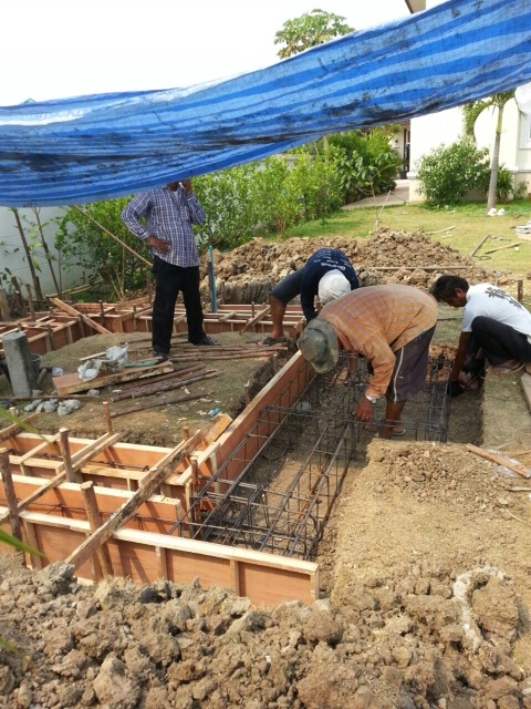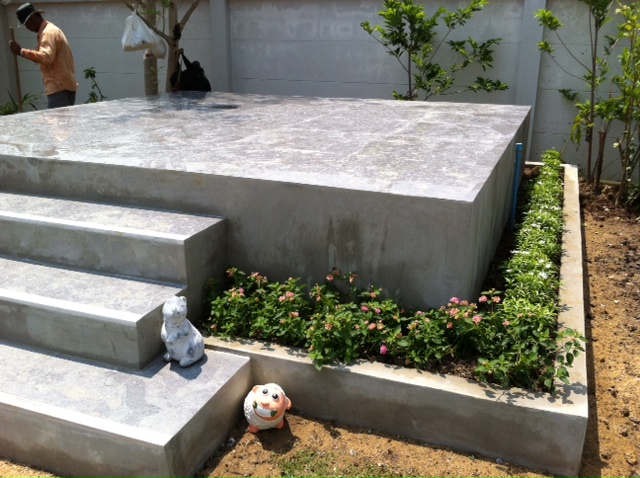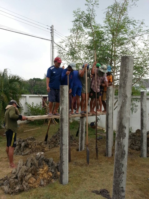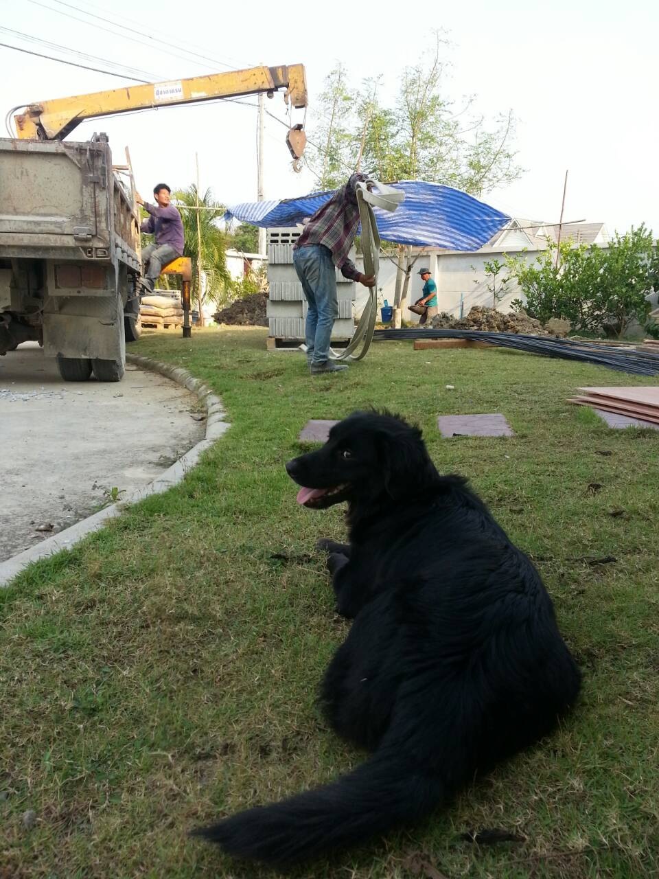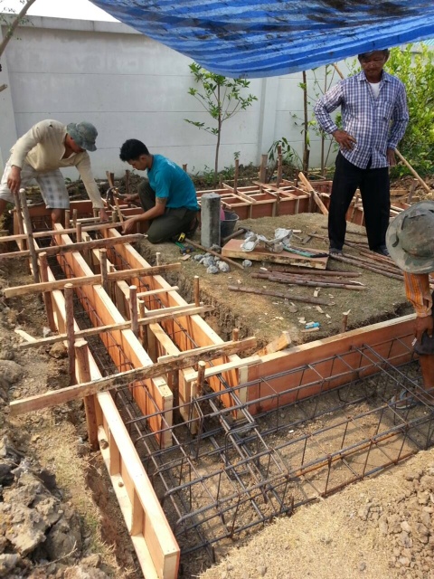 เริ่มต้นด้วยการก่อสร้างฐานศาลกันก่อนนะคะ (มีผู้ช่วยคุมงานค่ะ ตีสนิทกับช่างขอเป๊บซี่กินได้แล้วค่ะ)