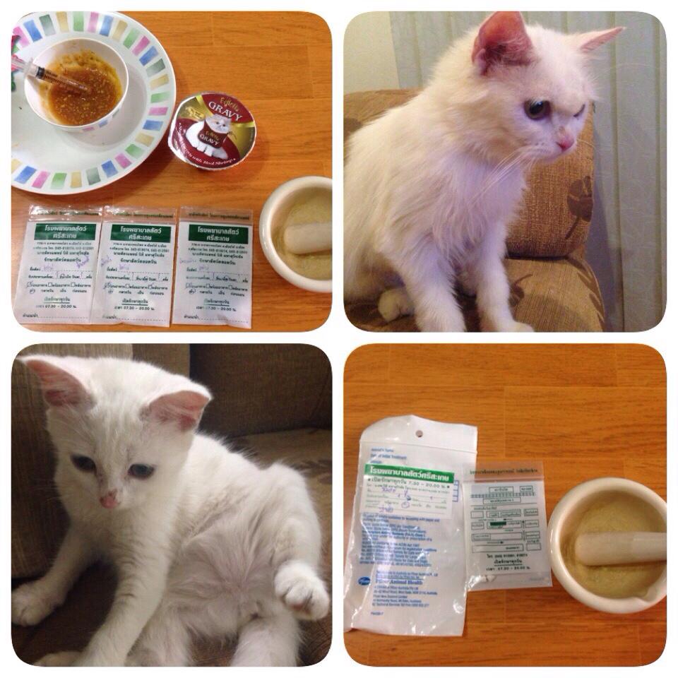 ขนร่วง ร่างกายผอม ปากอักเสบ มีไรหู ความหวาดกลัวยังคงมีอยู่ ส่วนนมสดตัวลูก หนัก 1.5 กก อายุประมาณ 3 เดือน