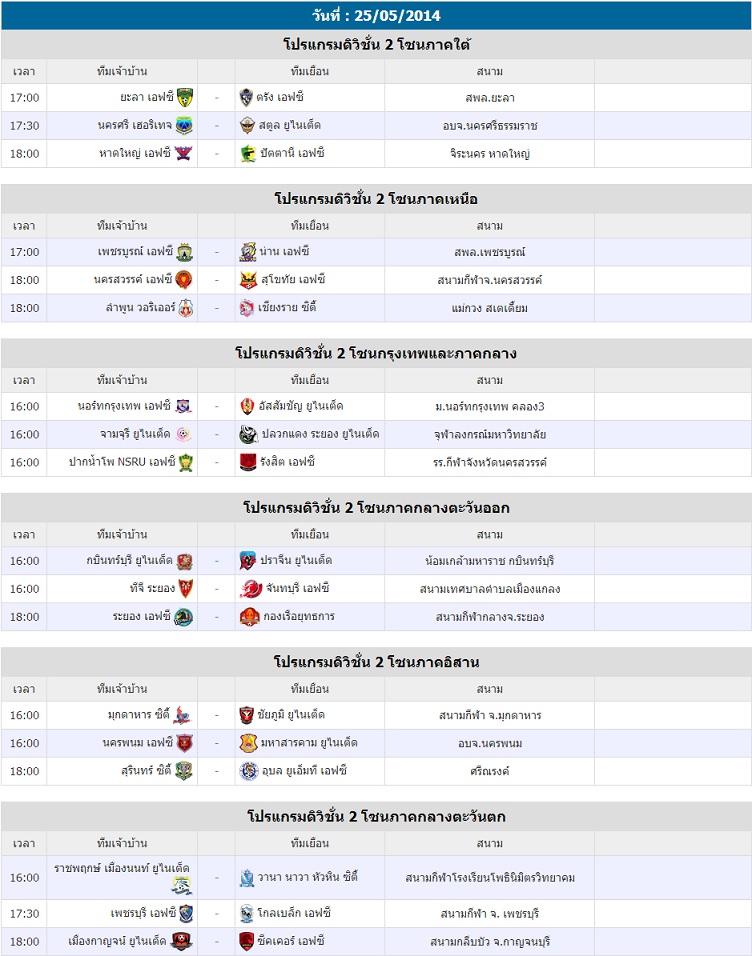 คู่ที่ไม่ได้เตะตอน 4 โมง อาจจะมีเปลี่ยนแปลงเวลาเตะบางคู่ ลองเช็คข่าวกันดูนะครับ (เห็นว่าคู่เมืองกาญจน์ กับ ซีคเกอร์ เลื่อนจาก 6 โมงมาเป็น 5 โมงแล้ว)