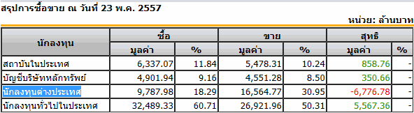 Sinthorn Summary 23/5/2557 : ต่างชาติขายสุทธิ -6,776.78 ลบ.