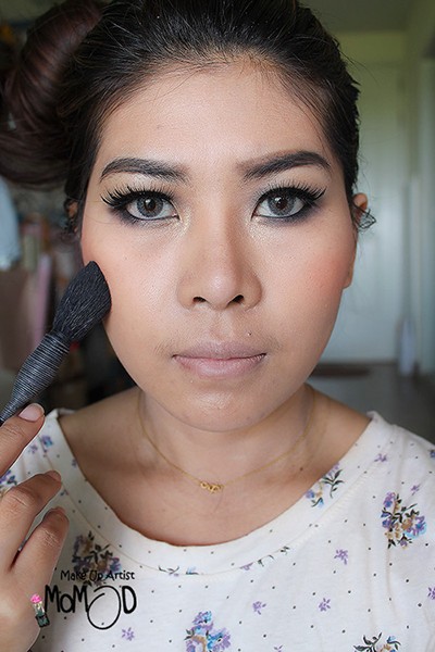 ปัดแก้มสีออกส้มเนื้อแมต เพื่อไม่ให้ดูเด่นกว่าตา แต่มีสุขภาพดี และเนื้อแมตจะได้ไม่สะท้อนเวลาถ่ายรูป