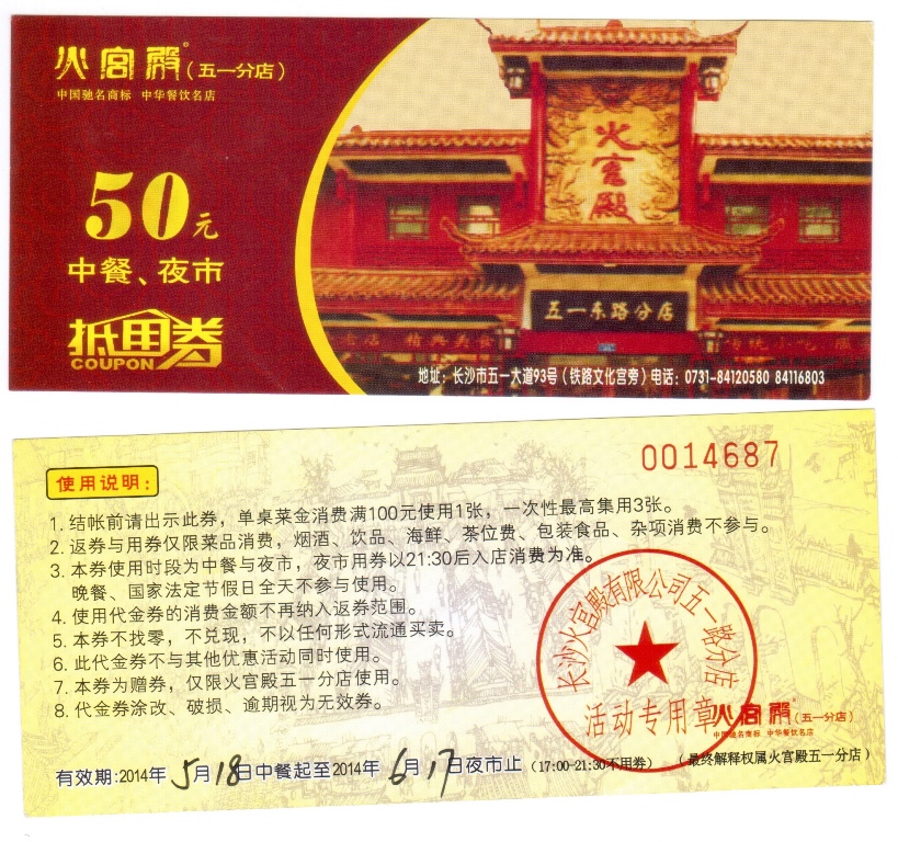 เนื่องจากเมื่อสัปดาห์ที่แล้วไปเที่ยวฉางซามาแล้วได้ไปลองชิมอาหารร้านหั่วกงเตี้ยน ซึ่งได้ชื่อว่าเป็นร้านที่โด่งดังมากในเรื่องของการปรุงเต้าหู้เหม็น แล้วได้บัตรแบบนี้มาสองใบค่ะ แต่อ่านจีนไม่ออก ไม่แน่ใจว่าเป็นบัตรส่วนลดหรือป่าว ใครอ่านออก ช่วยแปลให้ด้วยนะคะ หรือใครจะเดินทางไปเที่ยวภายในวันที่ 17 มิถุนายนนี้ ยกให้เลยค่ะ (ที่สำคัญอยากได้คนมาแปลให้ก่อนว่ามันเป็นบัตรส่วนลดจริงหรือป่าว?)