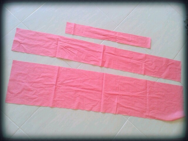 ตัดผ้าเป็นสามชิ้น คือ ขอบเอว กระโปรงชั้นนอก กระโปรงชั้นใน ขนาดก็วัดเอาตัวลูกสาวแหละค่ะ