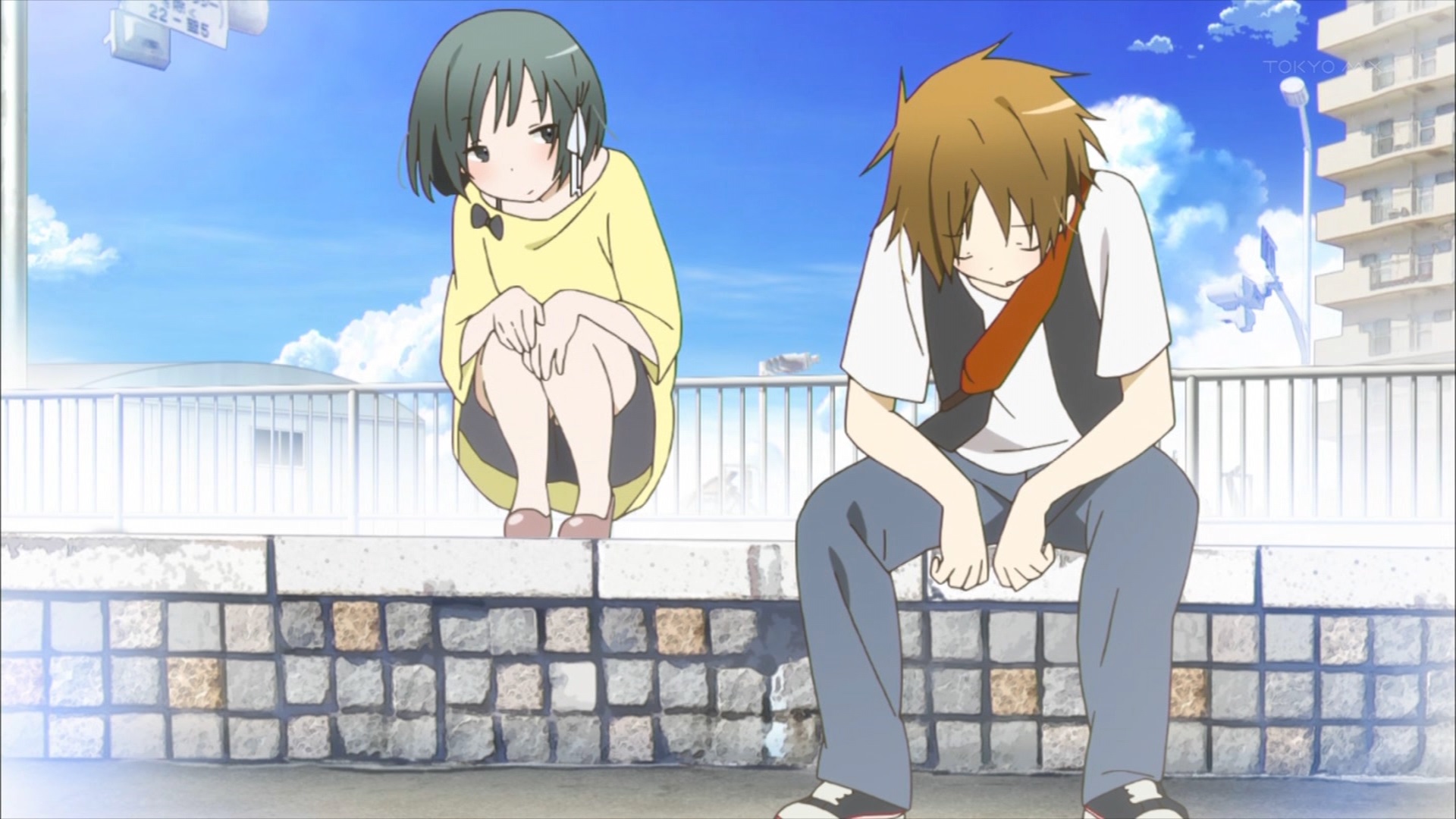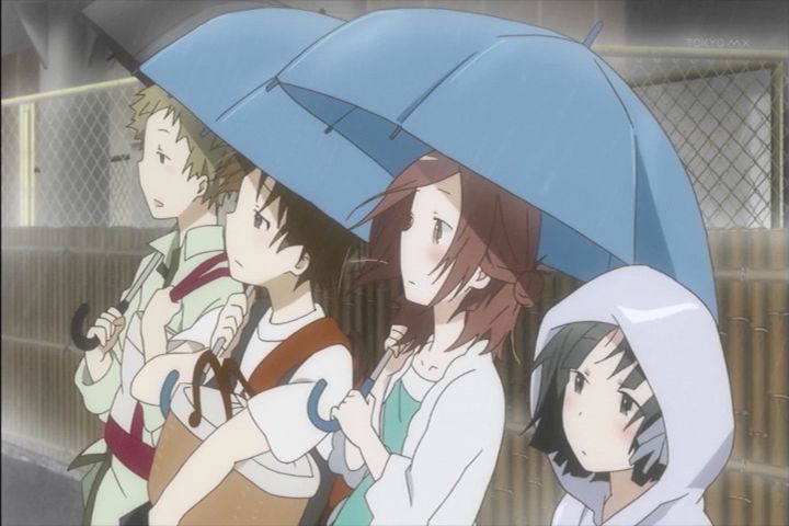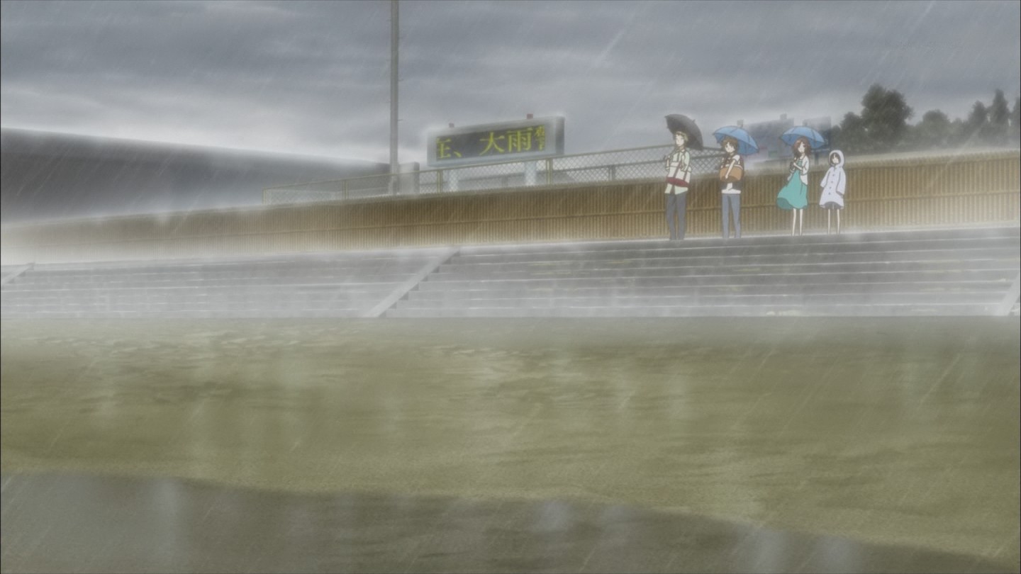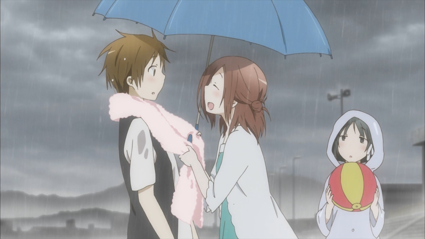 ถึง 3 คนจะพูดด้วยเสียงห่อเหี่ยวไปแล้วก็ตามแต่ยังมีอยู่คนเดียวที่ดูจะเป็น ทองไม่รู้ร้อน เดินต้านลมเล่นไปแล้วคนนึง ทั้งยังชวนให้ฟูจิมิยะมาเล่นก่อปราสาททรายกลางสายฝนกันอีกต่างหาก