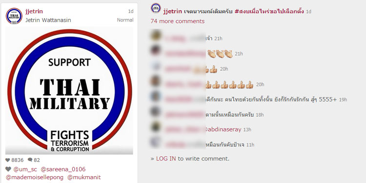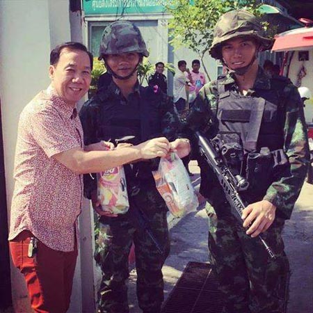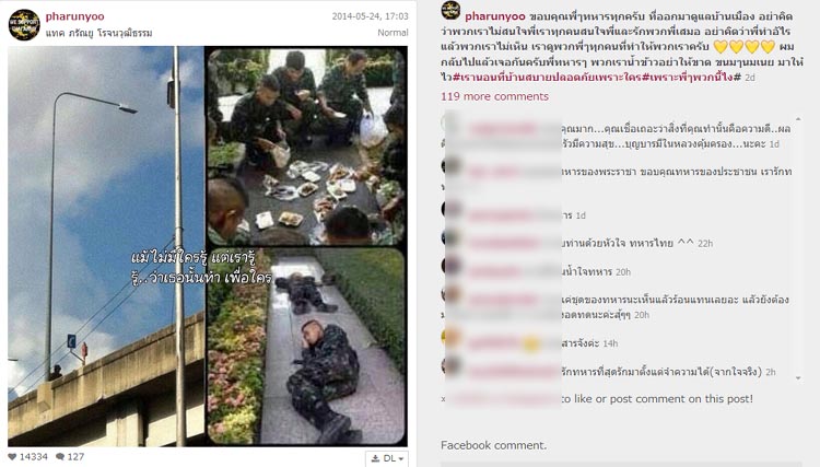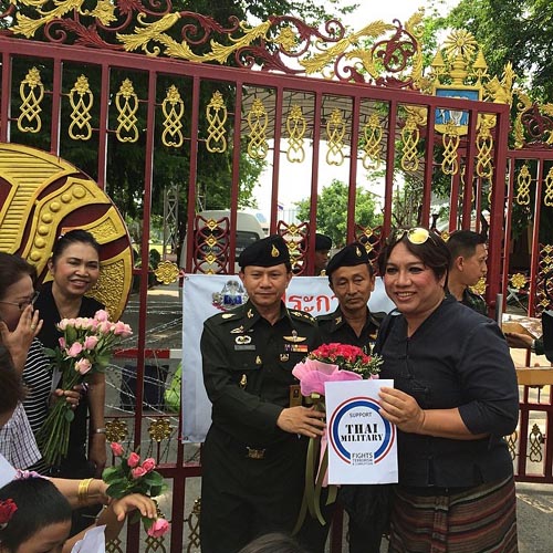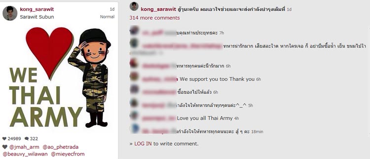 โดยหนึ่งในนั้นก็คือเหล่าบรรดาคนในแวดวงบันเทิงทั้งหลายที่นอกจากจะพากันโพสต์เฟซบุ๊กแสดงความเห็นด้วยแล้วบางส่วนยังได้ออกไปมอบอาหาร ขนม ดอกไม้ ฯ เพื่อเป็นกำลังใจให้กับทหารที่ทำหน้าที่เหล่านี้ด้วย อาทิ หมอก้อง, ท็อป ดารณี, ครูลิลลี่, ต่าย เพ็ญพักตร์ ฯ