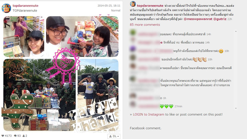 คนบันเทิงร่วมส่งใจพร้อมมอบดอกไม้ อาหาร เครื่องดื่มสนับสนุนทหารออกปฏิบัติหน้าที่ หลัง คสช. ประกาศยึดอำนาจ ชม “แอนนา ชวนชื่น”...สวดยวดไปเลยลวกเพี้ย...