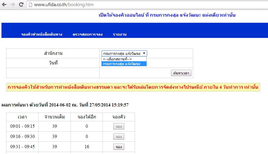 และอีกเรื่องคือ เว็บจองคิวมันขึ้นตัวหนังสือวิ่งว่าสำหรับจองที่แจ้งวัฒนะเท่านั้น ผมเลยงงว่า ทำไมมันไม่มีที่เอสพลานาดให้เลือก?