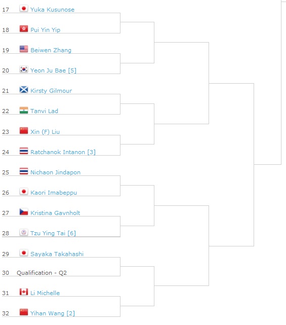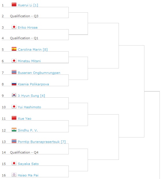 หญิงเดี่ยว สายบน Li Xue Rui น้องครีม Sung Ji Hyun น้องเมย์ Tai Tzu Ying Li Han น้องแนท Mitani Minatsu และ อานาเกะ ยามากูจิ ถ้าผ่านรอบคัดเลือกเข้ามาได้ จะอยู่สายนี้ ( แต่อยู่ครึ่งบน ไปชนกับ Sung Ji Hy