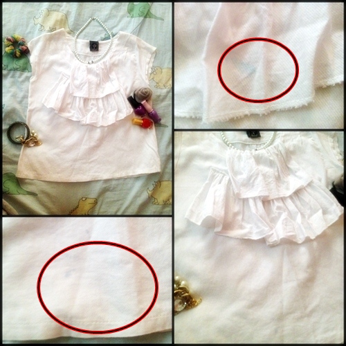 เสื้อสีขาว ผ้าคล้ายผ้าดิบ มีตำหนิสีตกจางๆ 2 ที่ ตามภาพค่ะ รอบอก 34" ความยาว 19" ราคา 50 บาท