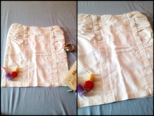กระโปรงทรงเอสีขาว ผ้าฝ้าย รอบเอว 30" สะโพก 34" ความยาว 18" ราคา 80 บาท