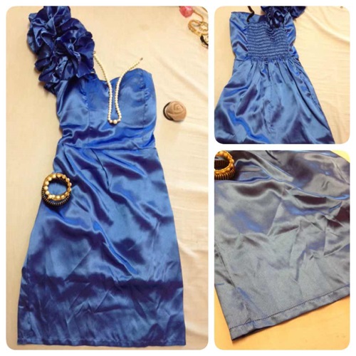 เดรสสีน้ำเงิน คาดไหล่ ผ้าอย่างดี รอบอก 24" (จัมพ์หลัง) รอบเอว 25" ยืดได้ สะโพก 28" ความยาว 30"