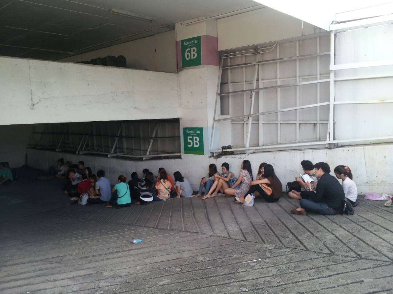 - เราก็มองไปรอบ ๆ ก็เห็นเค้านั่งรอต่อ ๆ กันตั้งแต่หน้าประตูเรื่อยมา และเริ่มยืนเป็นกระจุก ๆ หย่อม ๆ (คือ อธิบายยังไงดีล่ะ) ลักษณะไม่เหมือนคนยืนรอคิวอ่ะค่ะ เหมือนมานั่ง ๆ นอน ๆ รอประตูเปิด เราก็เข้าใจว่างั้น เออ แล้วก็ไม่มีใครมาแจกบัตรคิวอะไรไง ก็เข้าใจว่าเดี๋ยวพอประตูเปิด (8:00) ก็ค่อยไปเข้าคิวข้างหน้า สนง. กันอีกครั้งหนึ่ง