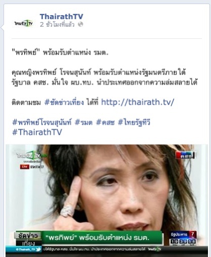 เอามาจากเว็บเสรีไทย อ่านข่าวหมอพรทิพย์แล้วมันยังไง เห็นหมอพรทิพย์เป็นยังไงคุณหมอด้วยกันถึงไม่สนับสนุน แพทย์หญิง คุณหญิงพรทิพย์ โรจนสุนันท์ โพสต์ เฟสบุ๊ค ชี้เเจงกรณีสื่อลงข่าวพร้อมรับตำเเหน่งรัฐมนตรีเป