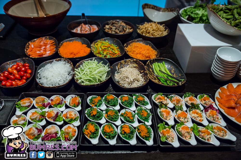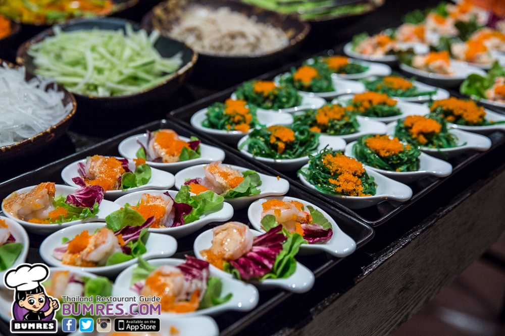มีทั้งสลัดแบบตะวันตกให้เราเลือกผักและน้ำสลัดกินเอง แล้วก็ยังมีสลัดแบบญี่ปุ่นที่มีสลัดงา ยำสาหร่าย ไว้ให้บริการในโซนนี้ นอกจากนี้ก็ยังมีแซลมอนรมควัน ซุปญี่ปุ่น และไข่ตุ๋นด้วย