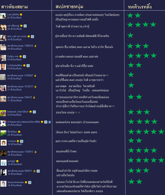 ปล. ผมใส่เรทติ้งมาให้ง่ายต่อการพิจารณานะครับ ดาวน้อยๆแสดงว่า การเข้าหาและจีบเธอจะดูลำบากนิดหน่อย อย่างเช่นคุณเรมี่นะครับ เธอต้องการคนมีไหวพริบดี ซึ่งถ้าเทียบกับหัวขี้เลื่อยอย่างเราๆ ที่มีแต่เรื่องหนัง AV อันนี้ลำบากหน่อยนะครับ หรืออย่างใครที่มีสเปคง่ายๆ ไม่เรื่องมาก อันนี้เรทติ้งดีครับ โดยเฉพาะคุณ junkgirl นะครับ แค่ตลกและตัวหอมก็ได้ใจเธอไปแล้ว ผมว่าจะซื้อน้ำหอมชาแนลมาอาบทุกวันแมร้งเลยครับ อิอิ