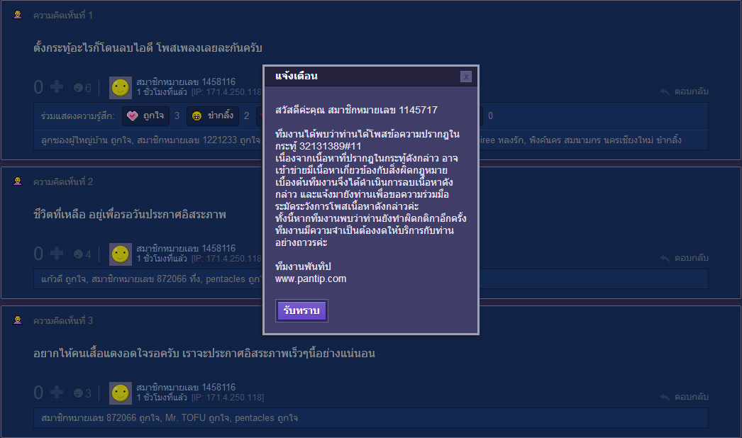 ใครที่แสดงตัวว่า ตัวเองมีมากกว่า 1 ล็อคอิน รีบไปแก้ไขข้อความของท่านเถอะครับ ตามกฎของพันทิป wm พันทิป อนุญาตให้มีคนละ 1 ล็อคอินเท่านั้น ถ้าตรวจสอบแล้วเจอว่ามีหลายล็อคอิน จะมีการแบนล็อคอินนั้นๆ หรือโดน