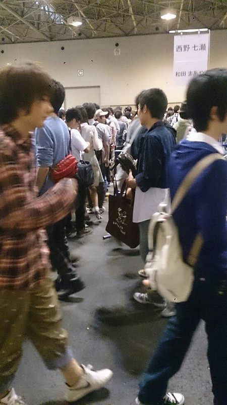 ครั้งนี้ผมเอาบัตรจับมือรวมไป 3 ใบ แน่นอนว่าใบแรกต้องเป็นริงโกะ เข้าแถวรอเจอตัวเป็นๆ ในระยะประชิดครั้งแรก เคยเจอแต่ระยะไกล วิธีเข้าตัวงานนั้นเข้าใจง่าย เมื่อเข้าไปในตัวอาคารจะมีประตูหน้าสำหรับแสดงว่ามีบัตรจับมือ จากนั้นไปเข้าแถวตามเลนที่มีป้ายบอกว่าใครบ้าง เมื่อถึงคิวก็ยื่นบัตรจับมือให้เจ้าหน้าที่ (งานรวมใช้ได้แค่ครั้งละใบเท่านั้น รวมหลายใบในทีเดียวไม่ได้) แบ-หงายมือให้ดูว่าไม่มีอะไร แล้วจึงเข้าไปเจอนางฟ้า >w<