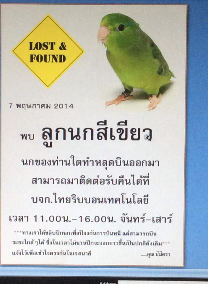 พบนกฟอพัส สีเขียว1ตัว มีห่วงขาสีชมพูสลักคำว่า POTxx (มีหมายเลขอีก2ตัว)