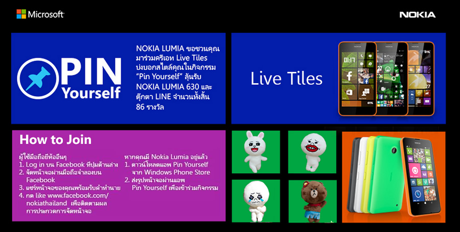 กิจกรรม "Pin Yourself" จัดหน้าจอ Live Tiles ในสไตล์ของคุณลุ้นรับ ตุ๊กตา Line และ Nokia Lumia 630 ร่วมสนุกได้ทุกยี่ห้อ