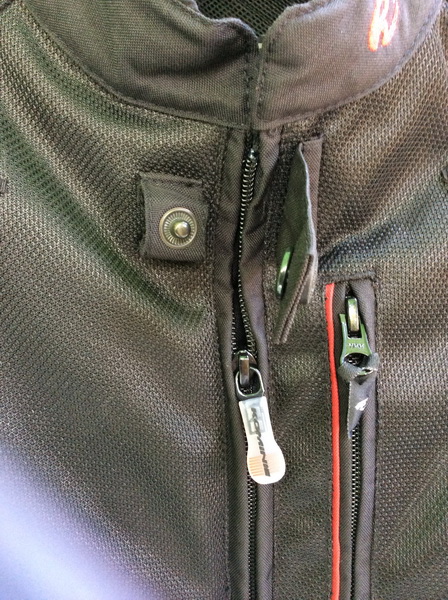 คอเป็นแบบคอตั้ง ด้านซ้ายปักสัญลักษณ์ (น่าจะเป็นรูปหัวเหยี่ยวไหม?) สีแดง และตัวหนังสือสีขาว ต่ำลงมาตรงกลางเป็นกระดุมแป๊กปิดซิปเวลารูดขึ้นสุด ตัวประดุมหุ้มด้วยพลาสติกสีดำพิมพ์ตรายี่ห้อเช่นเดียวกัน ข้างๆ ซิปกลางด้านซ้ายมีซิปเปิดกระเป๋าขนาดใหญ่พอที่จะใส่มือถือขนาดใหญ่ได้แต่ความลึกจะไม่มากนัก ถัดออกไปเป็นยี่ห้อพิมพ์บนแถบผ้าสะท้อนแสง มองที่วัสดุที่ใช้ประกอบเป็นตัวเสื้อ จากตรงนี้จะเห็นวัสดุที่ต่างกัน 3 ชนิด ตัวเสื้อด้านหน้าทั้งหมดเป็นผ้าตาข่ายค่อนข้างทึบทอจากเส้นใยขนาดใหญ่ ส่วนใต้ไหล่เป็นตาข่ายทอด้วยเส้นใยขนาดเล็กกว่าโปร่งจนเห็นผ้าตาข่ายซับในผ้าแบบนี้จะคลุมยาวตลอดข้างลำตัวลงไปจนถึงเอว ส่วนหัวไหล่ทำด้วยหนัง