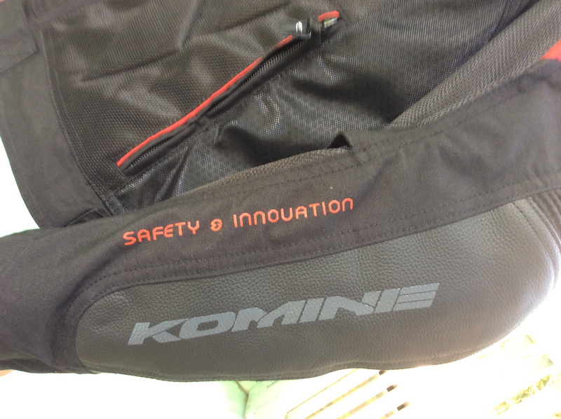 ป้ายยี่ห้อ Komine Safety & Innovation พิมพ์บนผ้าสะท้อนแสงขนาดไม่ใหญ่มากนักที่อกด้านซ้าย และอีกอันพิมพ์ตัวนูนบนยางเกือบใสที่เอวด้านหน้าขวา ซิปอันเดียวยาวตลอดด้านหน้า กระเป๋าซิปขนาดใหญ่ 3 อัน ด้านล่างซ้าย ขวา และหน้าอกซ้าย ที่แนวบริเวณไหปลาร้า มีแถบผ้ากว้างประมาณ 1 นิ้ว ตีตรา Komine สีแดง เอาไว้ใช้ทำอะไรรอดูเฉลยช่วงท้ายๆ ครับ